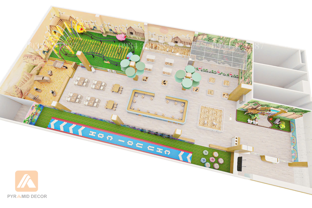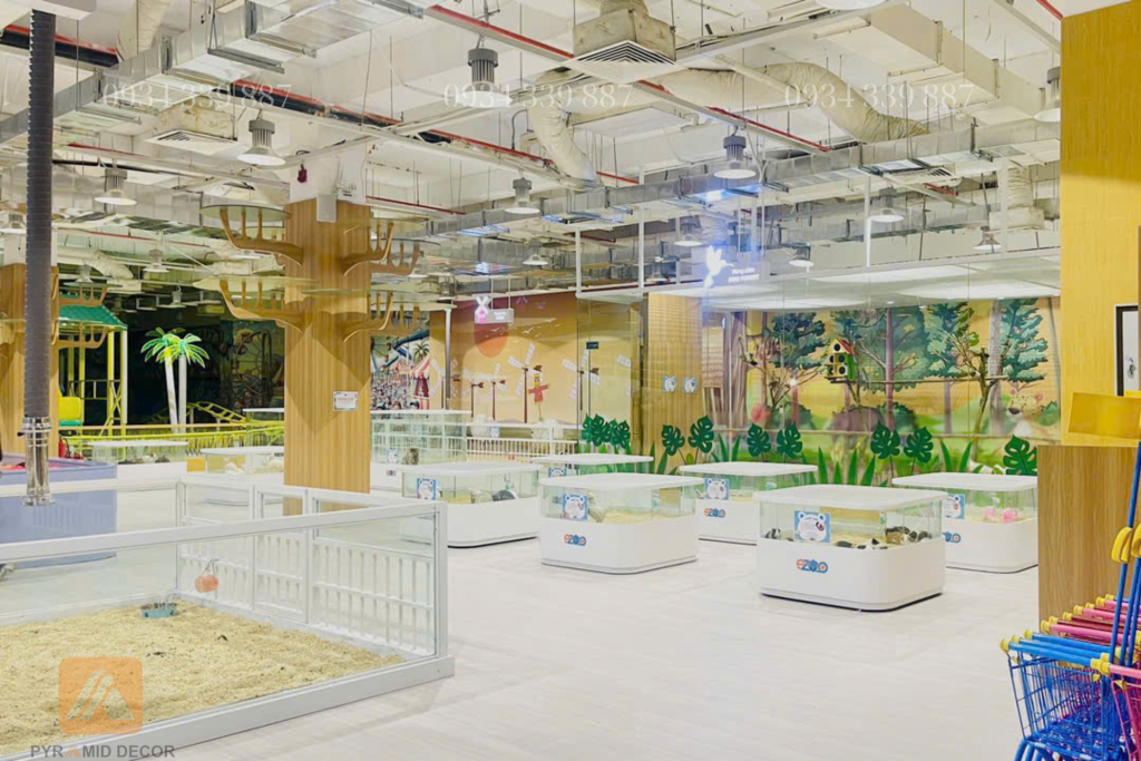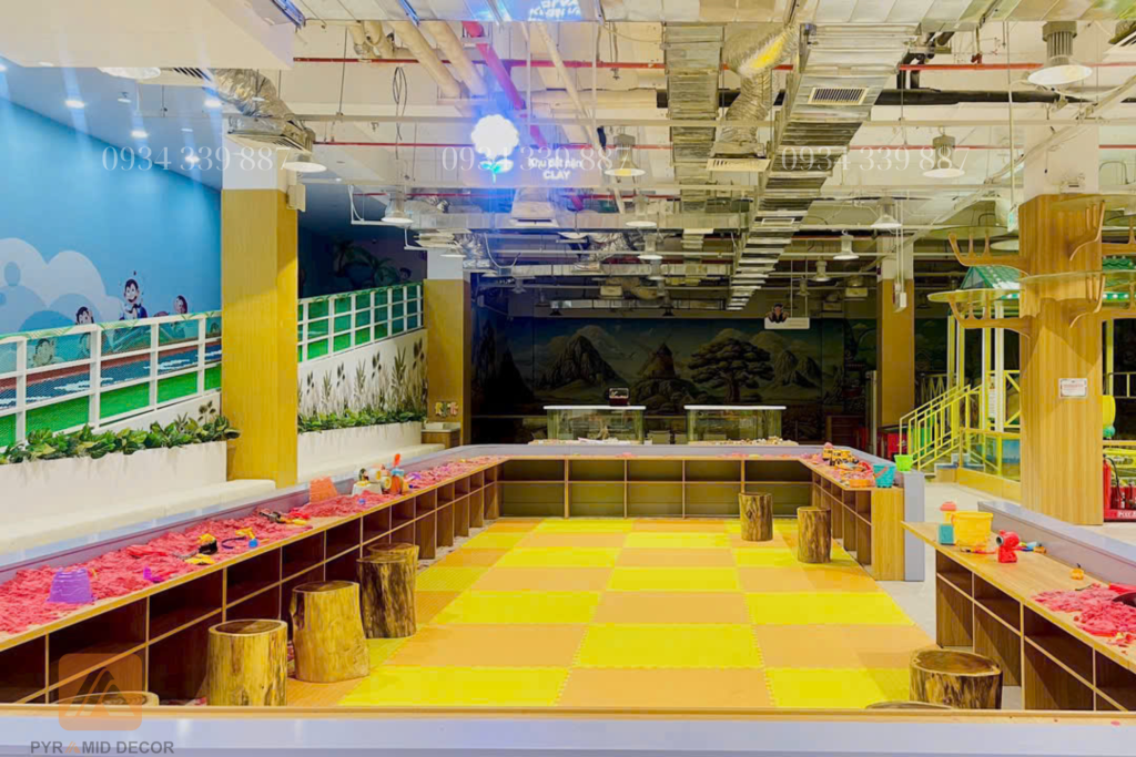 Trong dự án này, Pyramid Decor không chỉ dừng lại ở thiết kế và thi công, mà còn nghiên cứu hành vi và nhu cầu trải nghiệm của trẻ nhỏ. Từ đó, đội ngũ đã phát triển concept “học mà chơi – chơi mà học”, giúp các bé vừa được giải trí, vừa mở rộng hiểu biết về thiên nhiên.