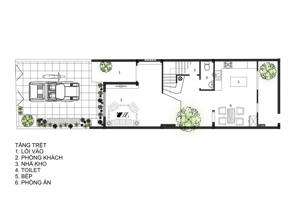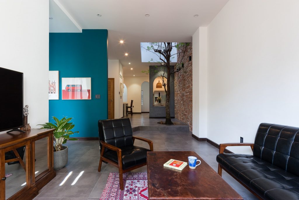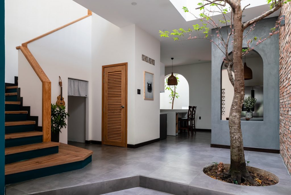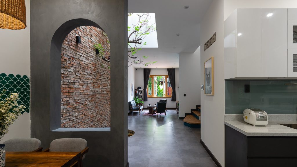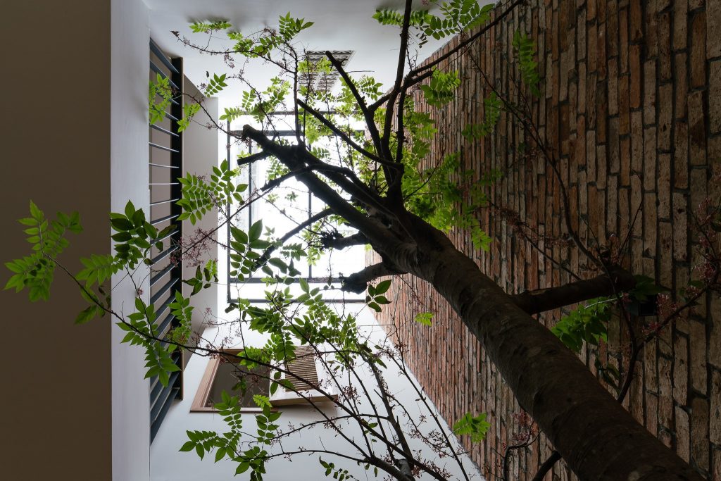 Bên trong, để bù lại việc ít cửa sổ ngoài mặt tiền, nhà có hai giếng trời, một nằm giữa bếp và phòng khách, một ở sân sau. Nên ban ngày, ngôi nhà hoàn toàn không cần dùng đèn. Ngoài nhiệm vụ lấy ánh sáng và thông gió tự nhiên, giếng trời kết nối không gian các tầng với nhau.