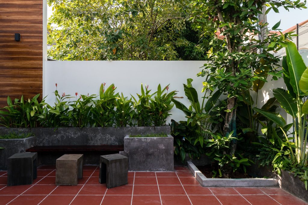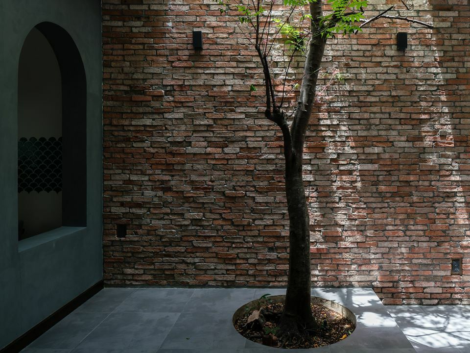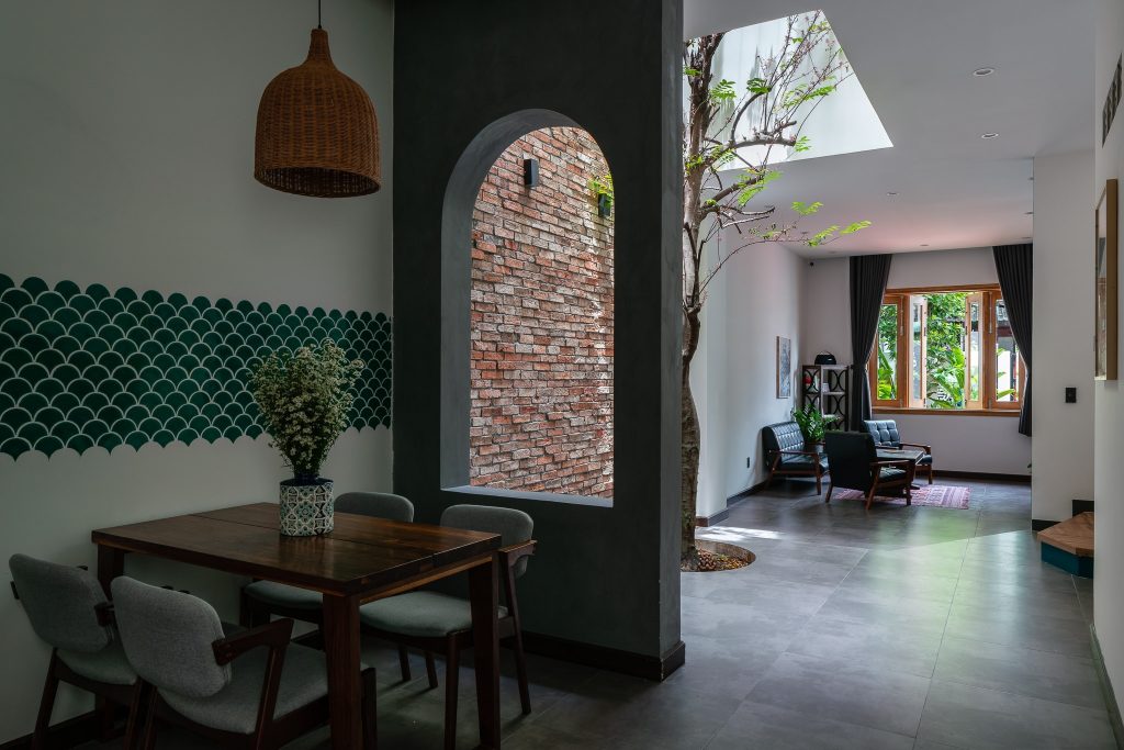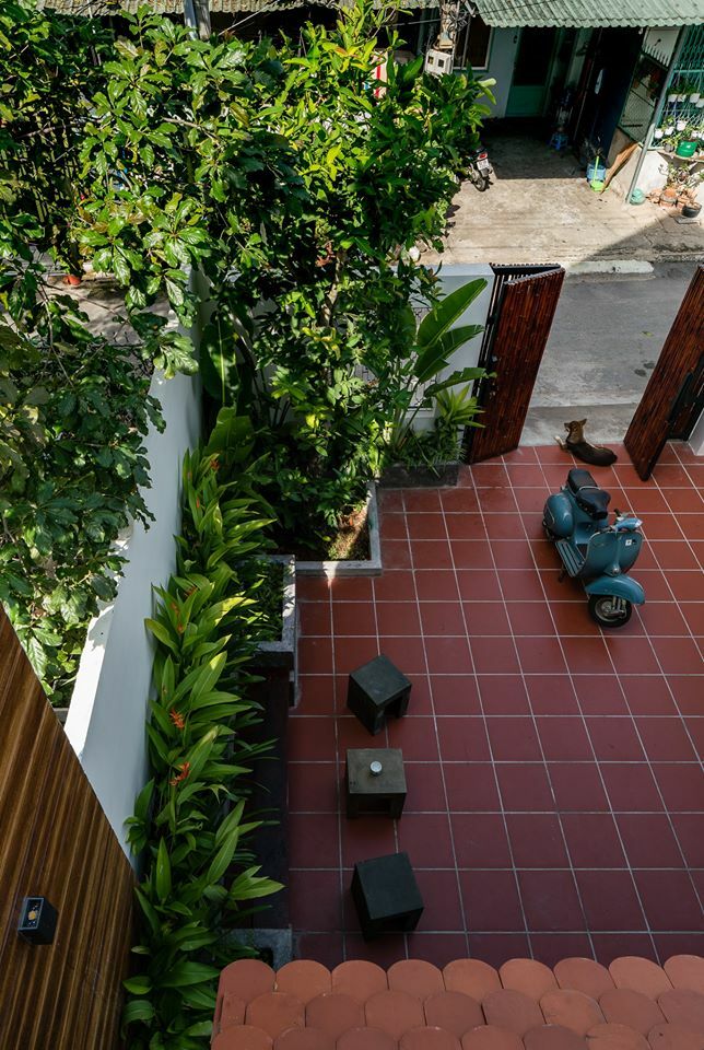 Lối vào nhà đảm nhận nhiều chức năng khác nhau. Ban ngày, nó là không gian đệm, chắn nắng và hạ nhiệt dần giữa hai không gian ngoài trời và trong nhà. Đến chiều, nó trở thành luồng hút gió và “hút” cả người bố trở về.