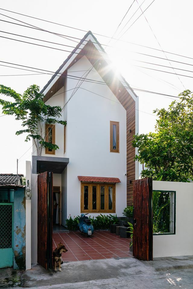 Bề ngoài, công trình lấy cảm hứng từ tranh vẽ trẻ con với mái chóp nón và hình khối đơn giản. Mặt tiền hướng Tây Nam, hứng nắng chiều gắt nên kiến trúc sư hạn chế số lượng và kích thước cửa sổ.