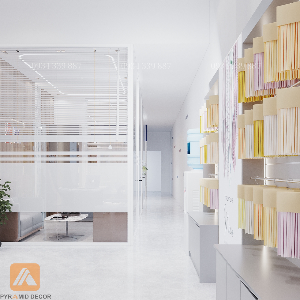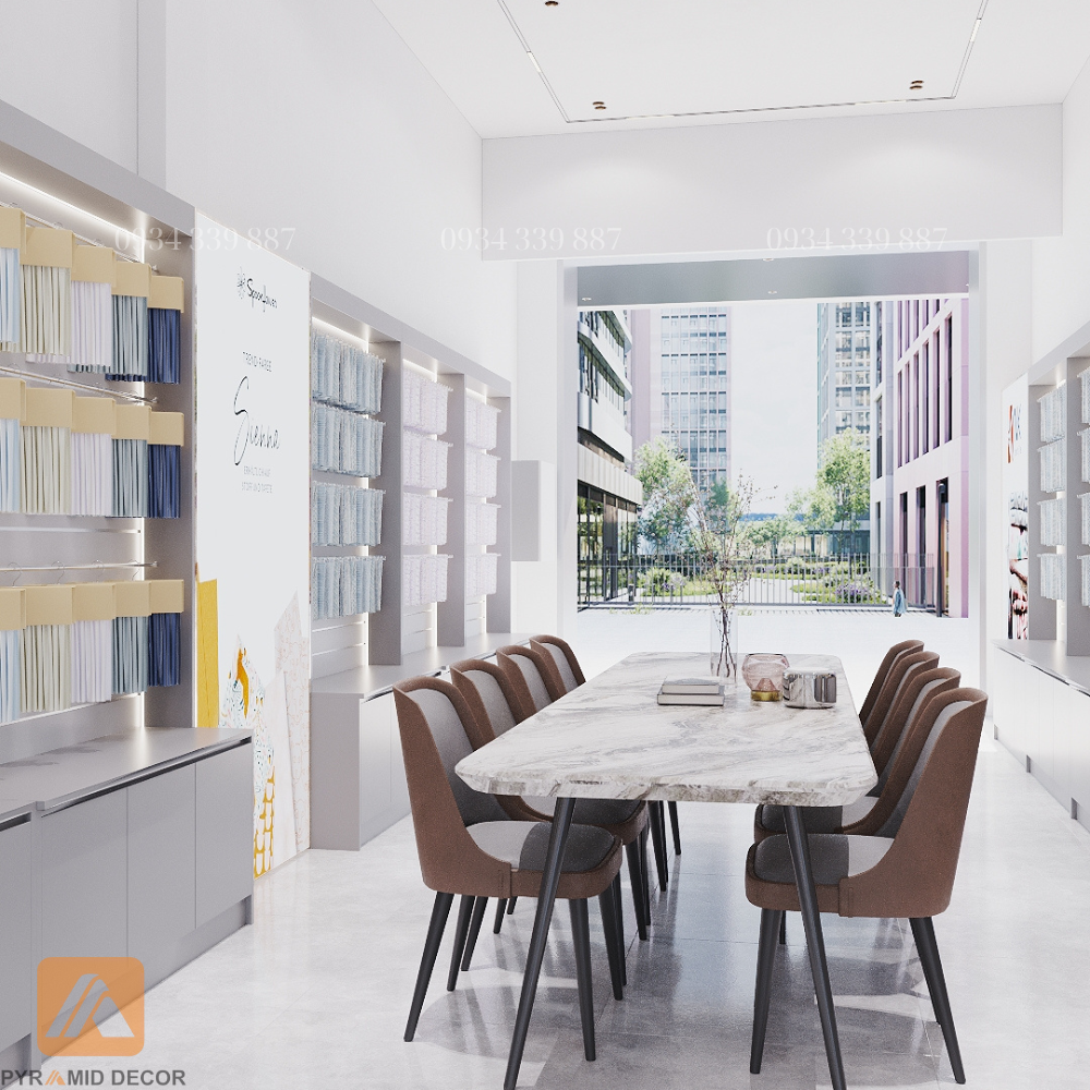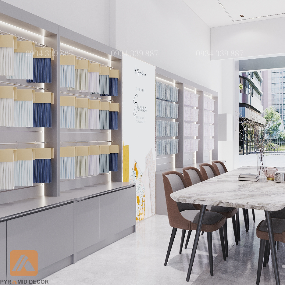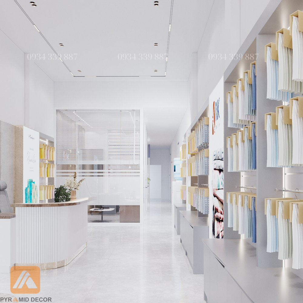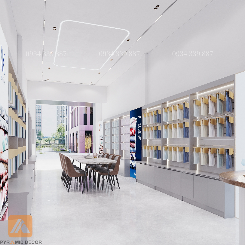 Mô phỏng chi tiết từng khu vực trưng bày, lối đi, ánh sáng và màu sắc – giúp chủ đầu tư hình dung rõ ràng không gian thực tế trước khi thi công. Từ cách bố trí tủ kệ, quầy cắt vải đến khu vực tiếp khách, mọi yếu tố đều được tính toán kỹ lưỡng để tối ưu trải nghiệm mua sắm và vận hành.